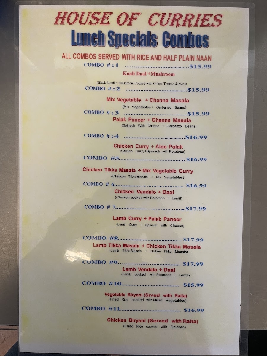 The menu at House of Curries in Berkeley offers a wide variety of flavorful dishes, reflecting traditional Indian cuisine. For those craving rice, options include Plain Rice and Chana Palau, along with more elaborate dishes like Prawn Biryani and Vegetable Biryani, each bursting with aromatic spices. The Lamb Curries section features rich options such as Bhindi Ghosht, Achar Ghosht, and the flavorful Karahi Ghosht, while meat lovers can also savor the Lamb Tikka Masala and Seekh Kabab Masala. There are delicious Goat Special dishes like Goat Tikka Masala, Goat Vindaloo, and Goat Curry, offering a range of tastes from mild to spicy. For chicken enthusiasts, choices like Achar Chicken, Chicken Tikka Masala, and Chicken Palak are available, along with other grilled specialties such as Chicken Tandoori - Breast and Lamb Chops Tandoori. Vegetarian patrons will enjoy the hearty Paneer Tikka Masala, Malai Kofta, and Mushroom Masala, while sides like Raita, Mango Chutney, and Mixed Pickles add flavor and balance. A selection of Tandoori Breads includes Naan, Keema Naan, and Garlic Roti, perfect for pairing with curries. The menu also offers tasty appetizers like Papad, Vegetable Pakora, and Vegetable Samosa, along with indulgent desserts like Kheer and Gulab Jamun. To complete the meal, diners can refresh themselves with beverages such as Mango Lassi and Soft Drinks. Overall, House of Curries offers a well-rounded menu catering to both meat lovers and vegetarians, ensuring a satisfying dining experience for all.